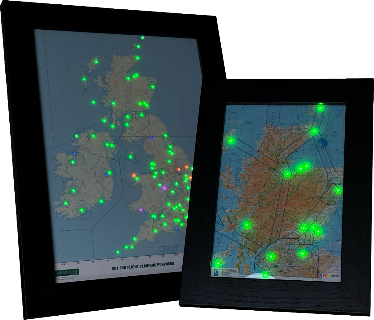 We can produce full-size illuminated charts using genuine CAA 1:500k VFR charts ideal for the wall of your FBO or flying school club house, and smaller A1, A2, and A3 sized charts adapted to your local flying area.